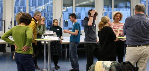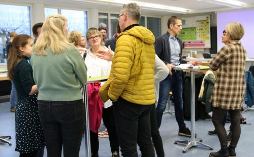 Danach traf man sich in Kleingruppen, um gemeinsam über verschiedene relevante Themen zu diskutieren, zum Beispiel über die Anforderungen in den aufbauenden Fächern, über Hausaufgaben- und Prüfungspraxis, über den Umgang mit psychischen Problemen oder später Migration der Schüler/innen und über das Programm CHANCE KSR. Die Gruppen setzten sich immer wieder neu zusammen, damit man mit verschiedenen Personen in Kontakt treten und bei Interesse auch eine weitere Zusammenarbeit vereinbaren konnte, wie zum Beispiel gegenseitiges Hospitieren im Unterricht der anderen Stufe.