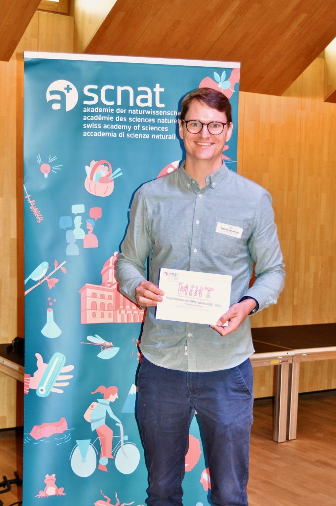 Aufgrund dieses vielfältigen Engagements im MINT-Bereich bewarben wir uns im Schuljahr 2024/25 bei der Schweizerischen Akademie der Naturwissenschaften (SCNAT) um das Label MINT-aktives Gymnasium. Nach der Einreichung unserer umfassenden Dokumentation besuchte eine Jury der SCNAT am 10. Februar 2025 unsere Schule und verschaffte sich vor Ort ein Bild von unseren Aktivitäten und Fachräumen.